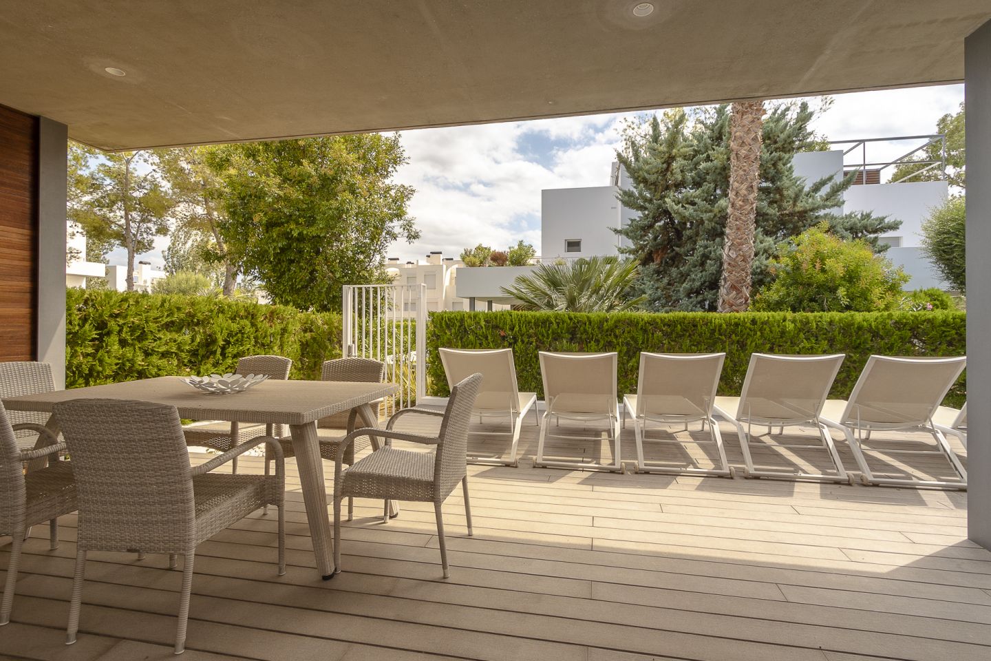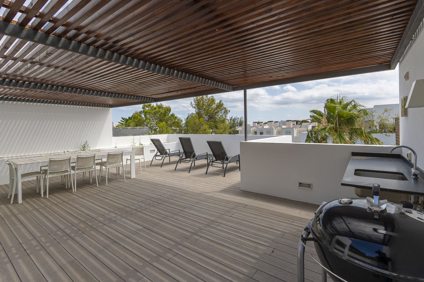 This south facing town house is situated close to the beach and Pine-walk in the residential and gated area of Bellresguard, in Puerto de Pollensa. The generous living space of 215.36 m2 between ground and first floor is distributed in four spacious double bedrooms, including a fantastic master suite with private terrace, a second suite perfect for guests and two more double bedrooms sharing a spacious bathroom, all at first floor level. The ground floor area consists of a spacious living dining room and a fully equipped open plan kitchen, both areas leading out to the covered terrace and the private garden of 22 m2. Furthermore, the property enjoys 182 m2 of terrace including a fantastic roof terrace with barbecue area and plenty of entertainment space. A second terrace at the upper level also provide a chillout with hot tub, and both terraces enjoy views of gardens and mountains. The community offers landscaped mature community garden and spacious pool area with sunbathing terraces. Air-conditioning and heating. Private garage with space for car and storage, laundry area and guest wc. Separate allocated parking lot in community area.