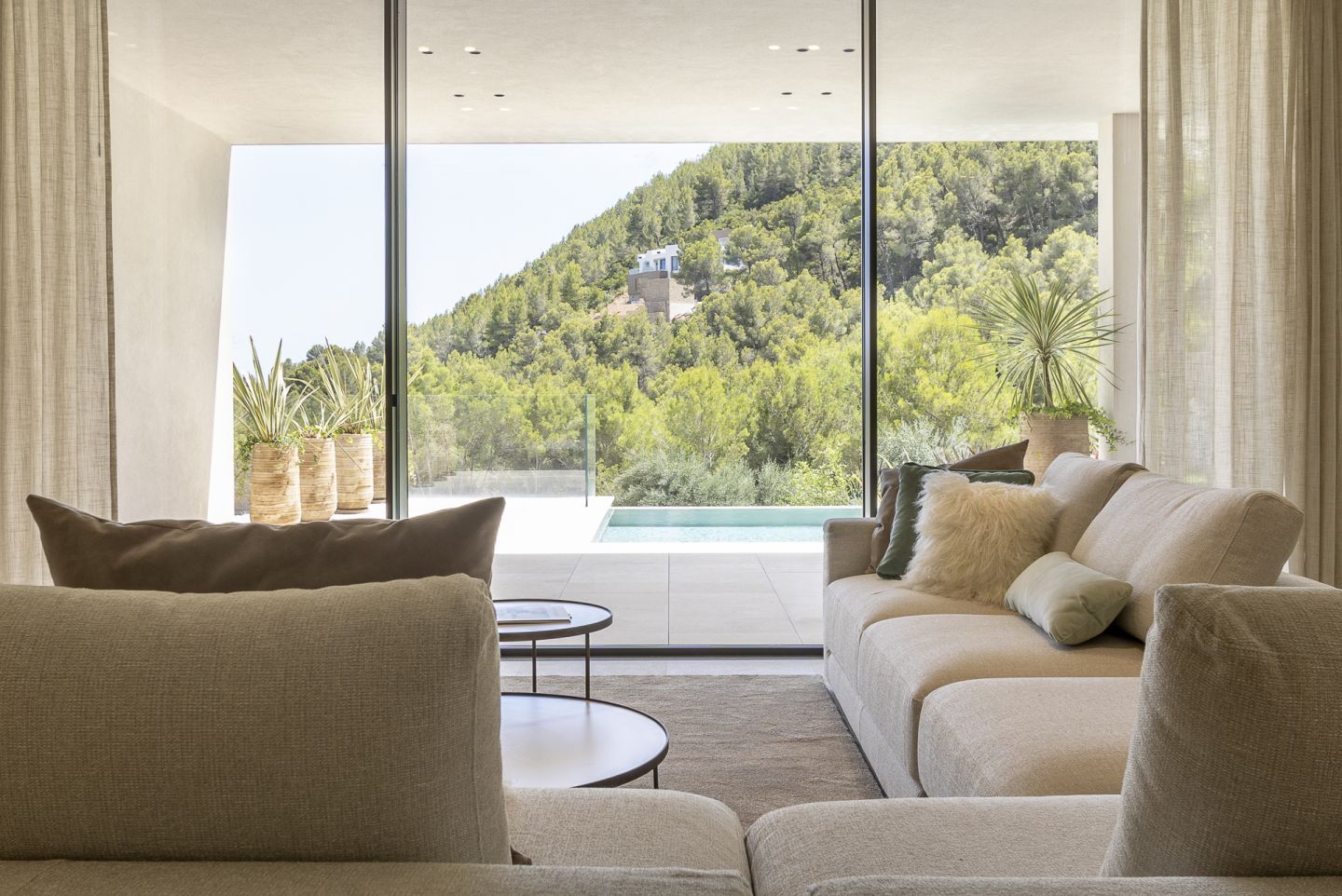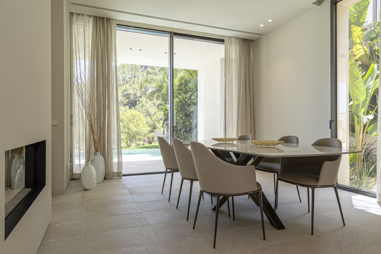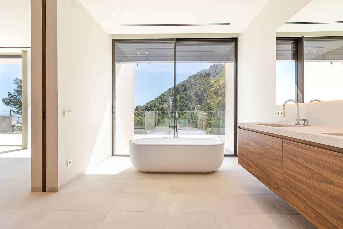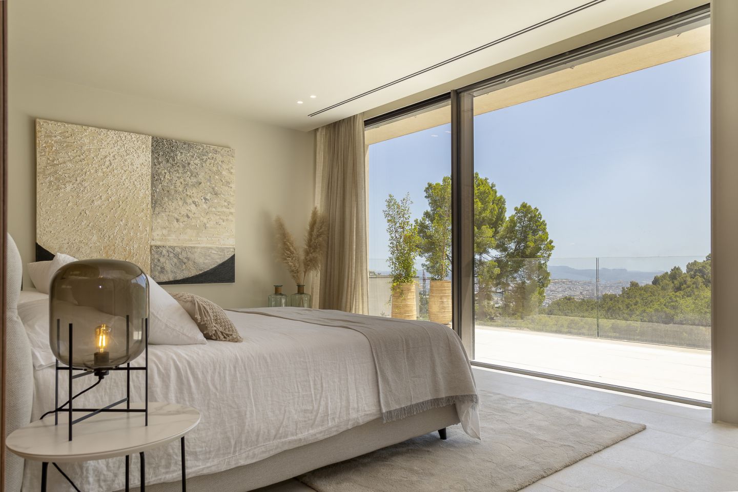 This new built villa is situated in the neighbourhood of Son Vida, one of the best locations on the Island of Mallorca, close to the town of Palma. The magnificent villa of 551 m2 is situated in a plot of 1118m2 and has four bedrooms and five bathrooms. The property impresses with the best materials to be found on the market, generous spaces, high ceilings, in a modern and contemporary design. The lower floor consists of open plan kitchen with cooking island and Gaggenau appliances, the living room with gas fireplace, the pool terrace with views of Palma, and a guest toilet and a guest bedroom with an en suite bathroom. On the first floor level is the spacious master suite with a dressing area, en suite bathroom and a large balcony. Adjacent to this are two further bedrooms, both with en suite bathrooms, as well as an additional terrace with a sauna. A fantastic roof terrace invites you to relax or entertain enjoying the many hours of mallorcan sunshine. The basement offers a garage with space for two cars, a multifunctional room that can be used as a gym or home cinema, a bathroom and plenty of storage space. The property features also include: an elevator, irrigation system, garden, underfloor heating via air heat pump, air conditioning.