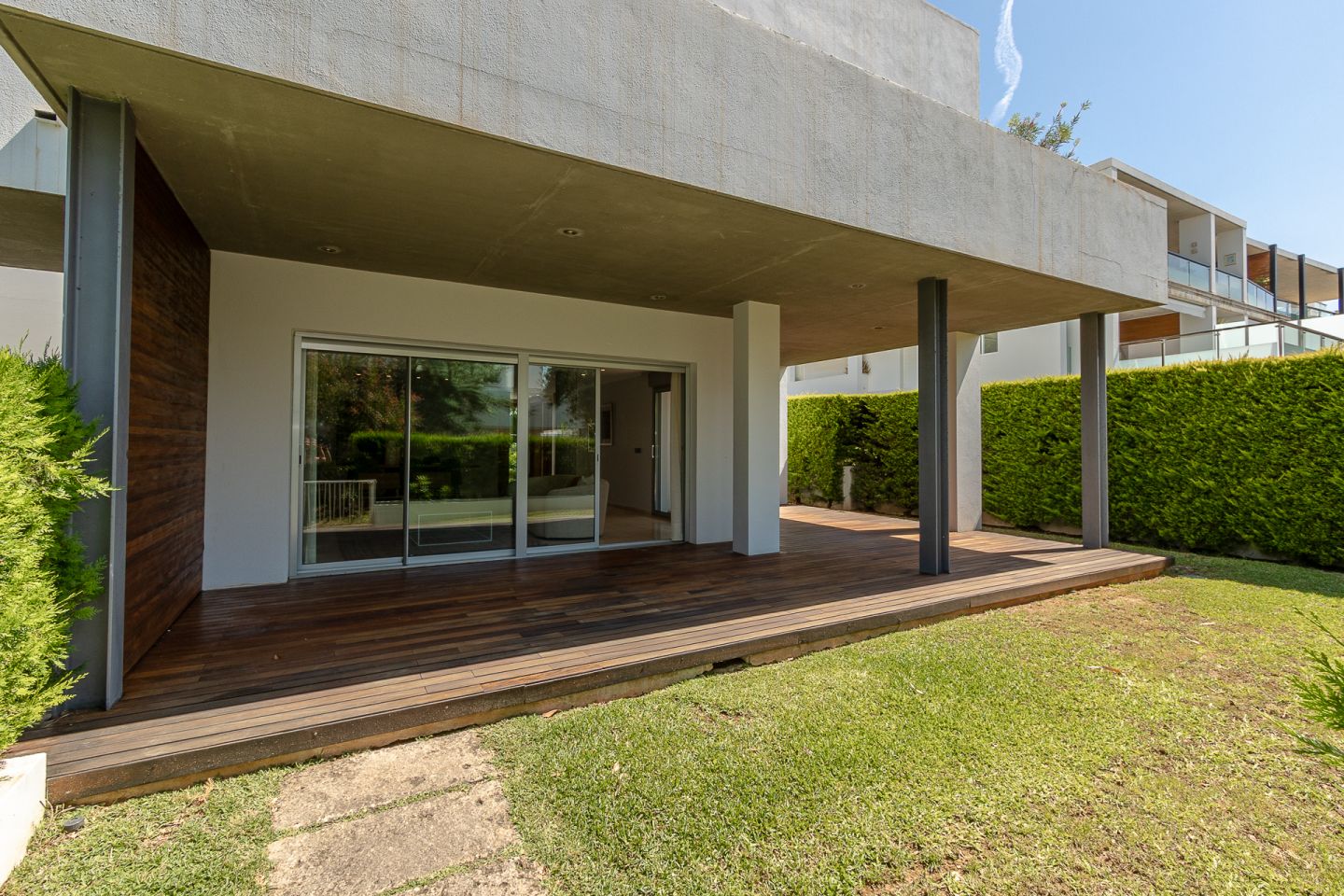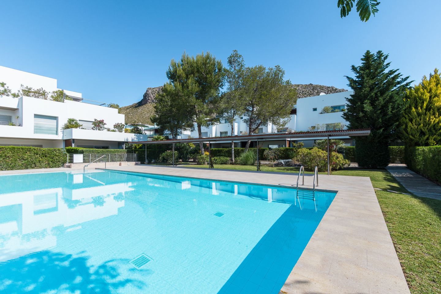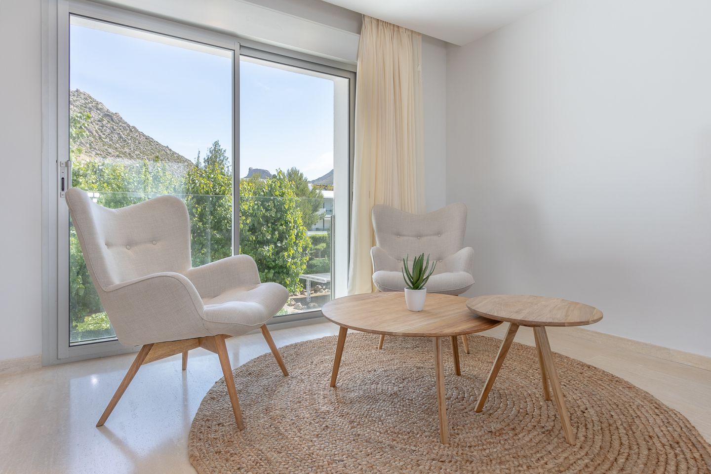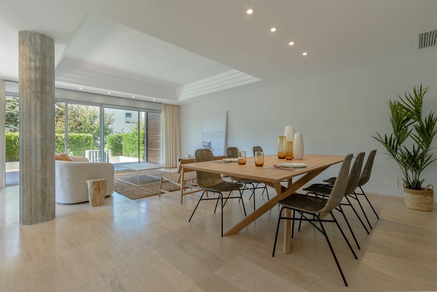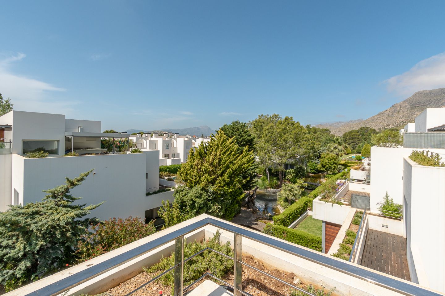 This south facing town house is situated close to the beach and Pine-walk in the residential and gated area of Bellresguard, in Puerto de Pollensa. The generous living space of 268.75 m2 between ground, first and second floor is distributed in four spacious double bedrooms, four bathrooms (three on suite), separate guest toilet, living/dining room, and kitchen with access to private garden of 52 m2 and covered terrace of 35 m2. Furthermore, the property enjoys 70 m2 of outdoor areas divided in four separate and private terraces, one with hot tub, all four situated in-between first and second floor level enjoying views of gardens and mountains. The community offers landscaped mature community garden and spacious pool area with sunbathing terraces. Air-conditioning and heating. Private garage with space for car and storage, plus a separate allocated parking lot in community area.