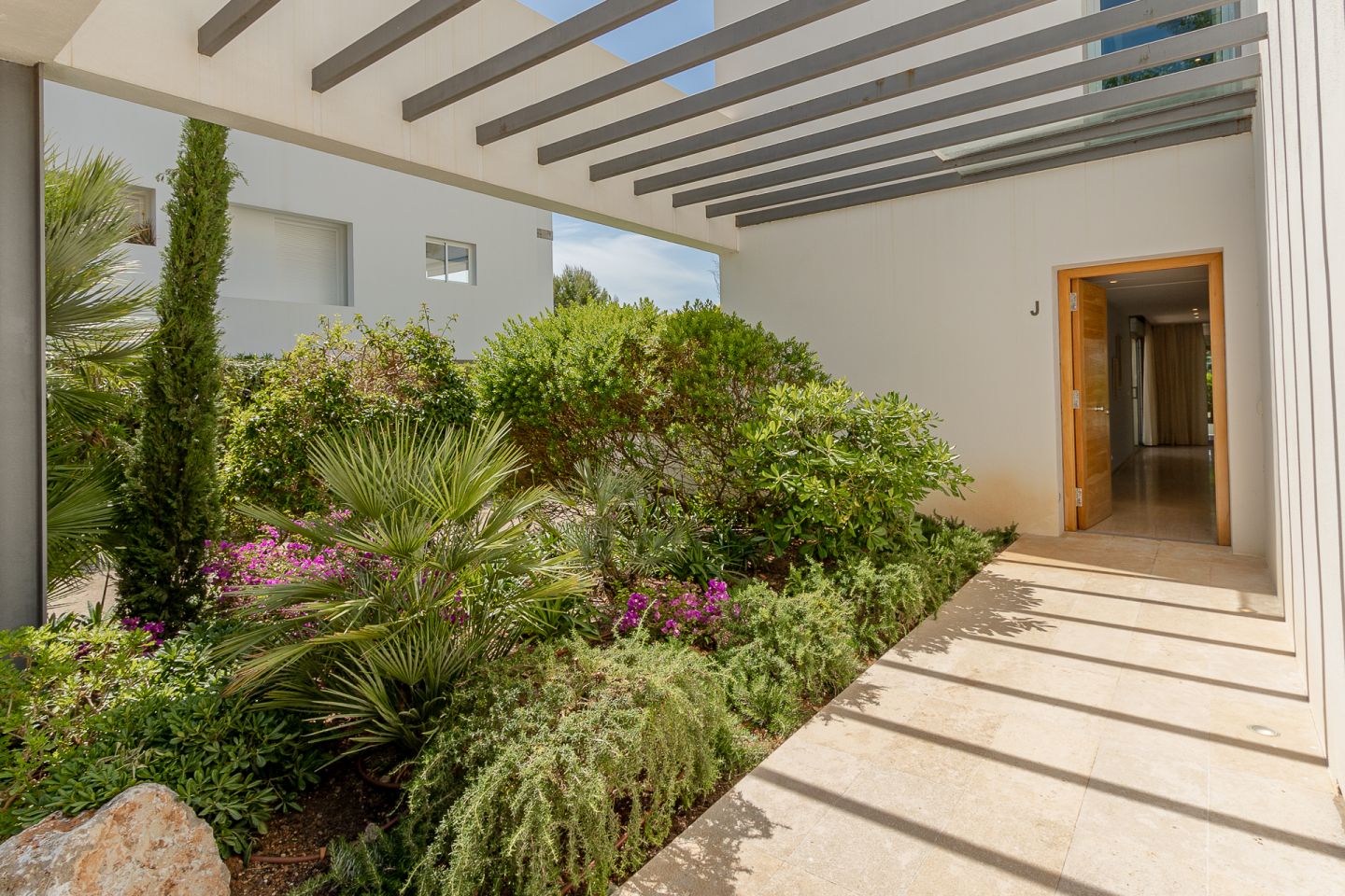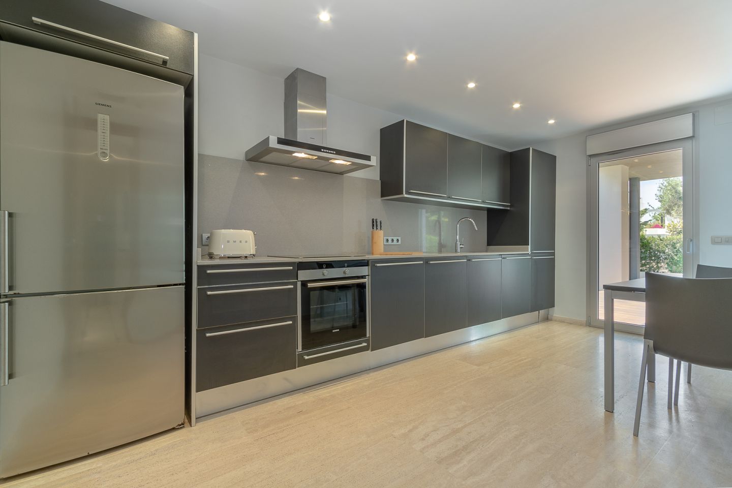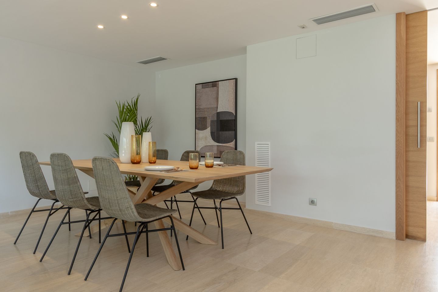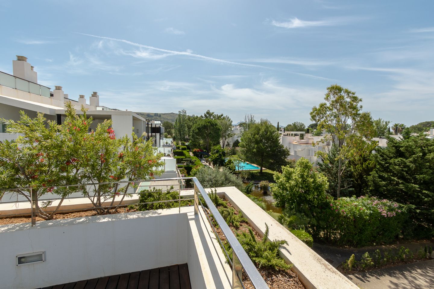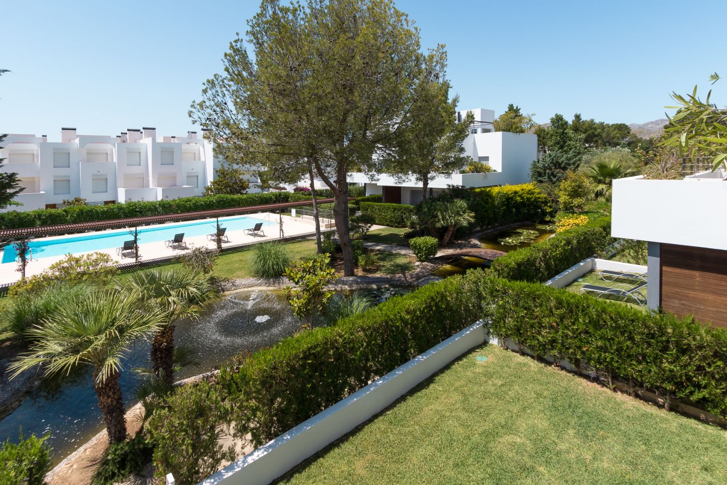 This south facing town house is situated close to the beach and Pine-walk in the residential and gated area of Bellresguard, in Puerto de Pollensa. The generous living space of 268.75 m2 between ground, first and second floor is distributed in four spacious double bedrooms, four bathrooms (three on suite), separate guest toilet, living/dining room, and kitchen with access to private garden of 52 m2 and covered terrace of 35 m2. Furthermore, the property enjoys 70 m2 of outdoor areas divided in four separate and private terraces, one with hot tub, all four situated in-between first and second floor level enjoying views of gardens and mountains. The community offers landscaped mature community garden and spacious pool area with sunbathing terraces. Air-conditioning and heating. Private garage with space for car and storage, plus a separate allocated parking lot in community area.