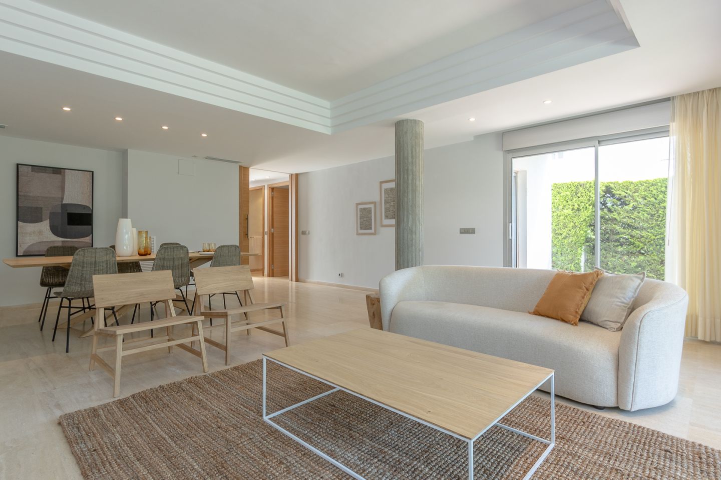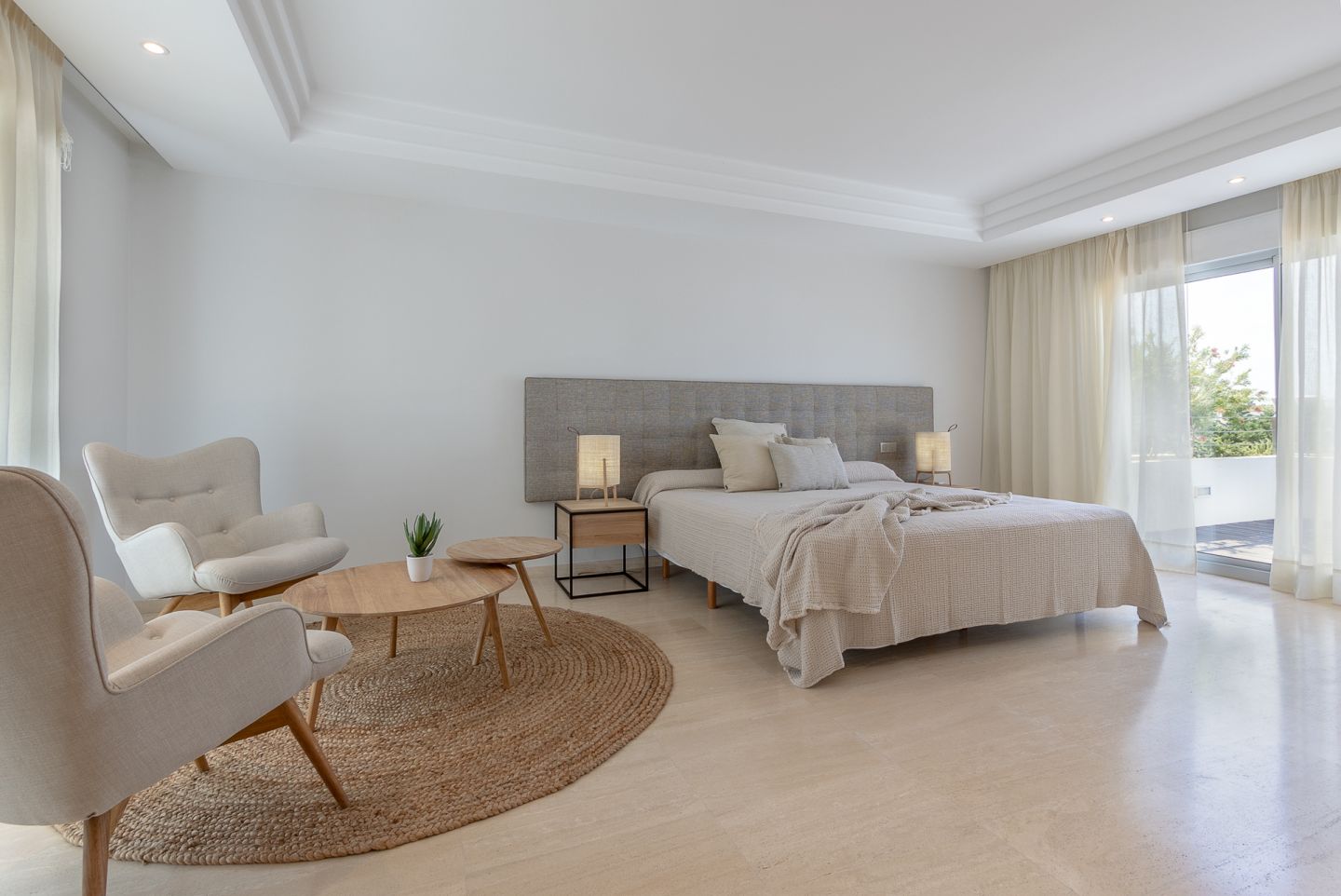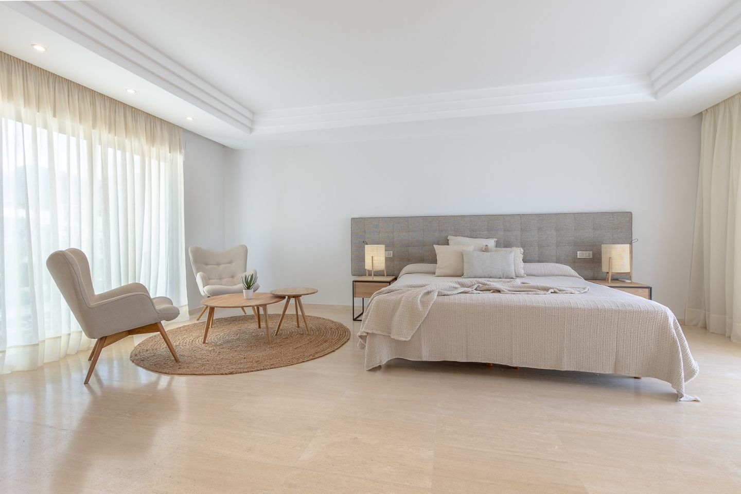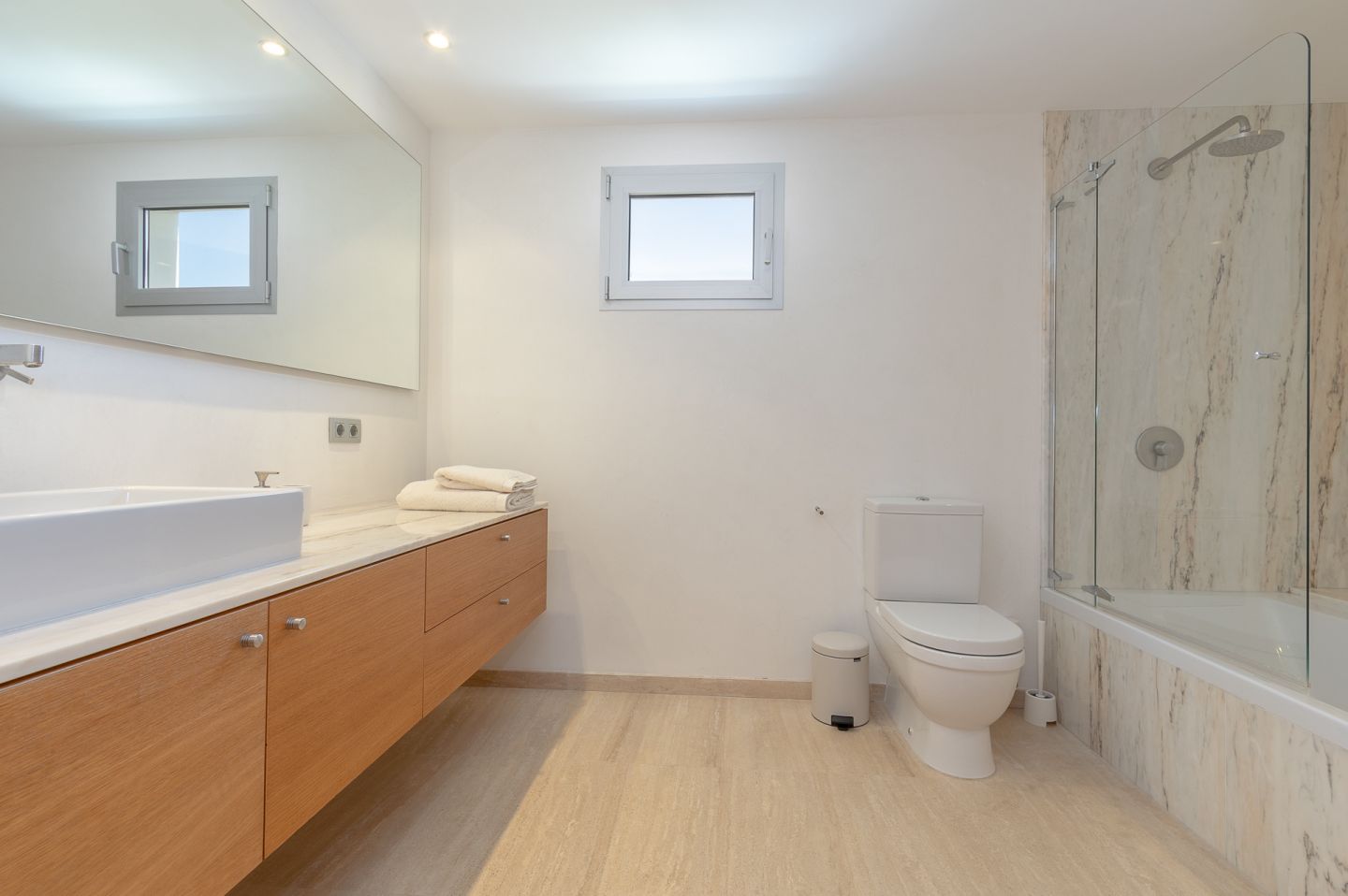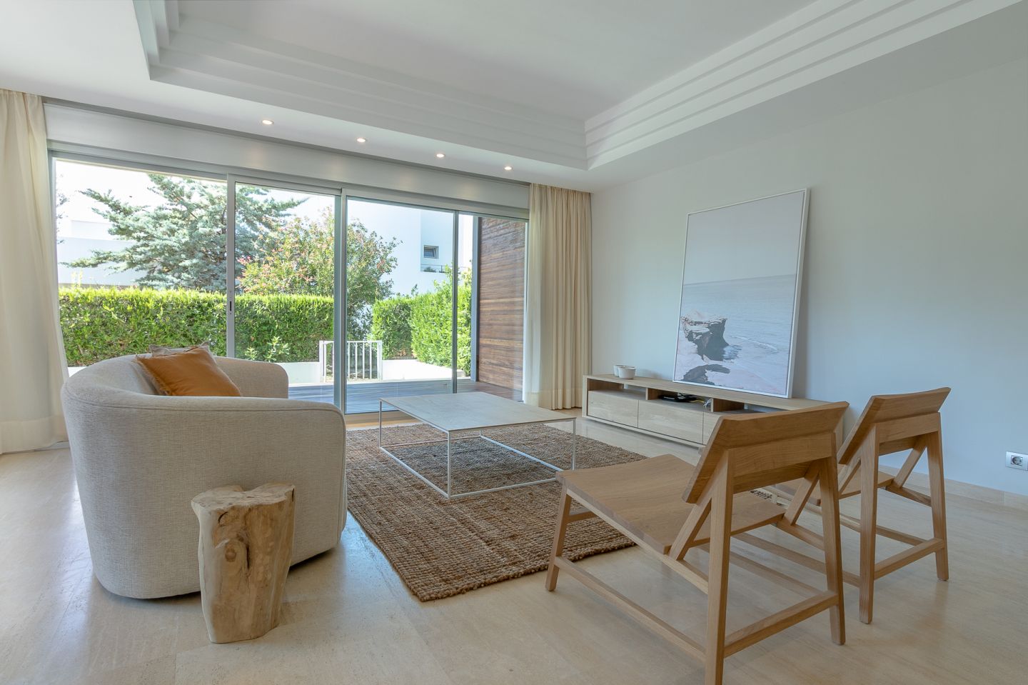 This south facing town house is situated close to the beach and Pine-walk in the residential and gated area of Bellresguard, in Puerto de Pollensa. The generous living space of 268.75 m2 between ground, first and second floor is distributed in four spacious double bedrooms, four bathrooms (three on suite), separate guest toilet, living/dining room, and kitchen with access to private garden of 52 m2 and covered terrace of 35 m2. Furthermore, the property enjoys 70 m2 of outdoor areas divided in four separate and private terraces, one with hot tub, all four situated in-between first and second floor level enjoying views of gardens and mountains. The community offers landscaped mature community garden and spacious pool area with sunbathing terraces. Air-conditioning and heating. Private garage with space for car and storage, plus a separate allocated parking lot in community area.